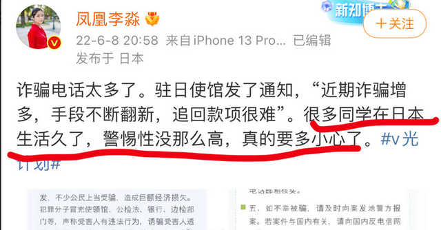 这名李姓女记者在转发驻日使馆的一条反诈提醒信息时,特意说了一句: