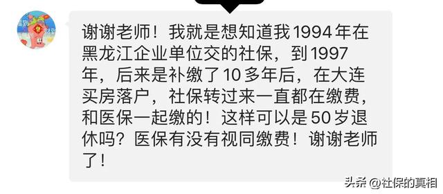 当事人:我就是想知道我1994年在黑龙江企业单位交的社保,到1997年,后来是补缴了10多年后,在大连买房落户,社保转过来一直都在缴费,和医保一起缴的!这样可以是50岁退休吗?